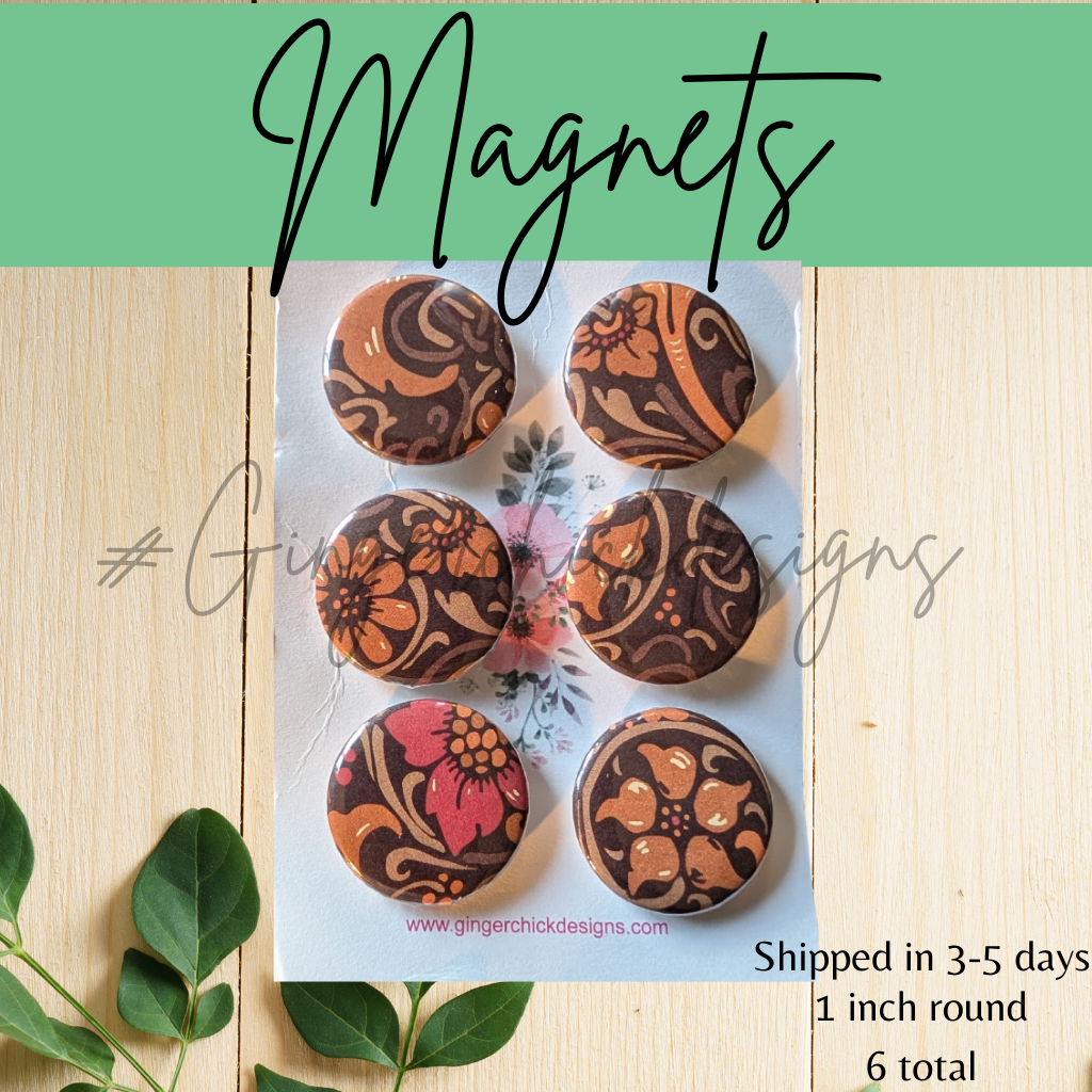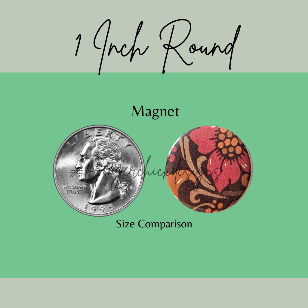 A set of 6 unique button magnets, each measuring 1 inch in diameter.