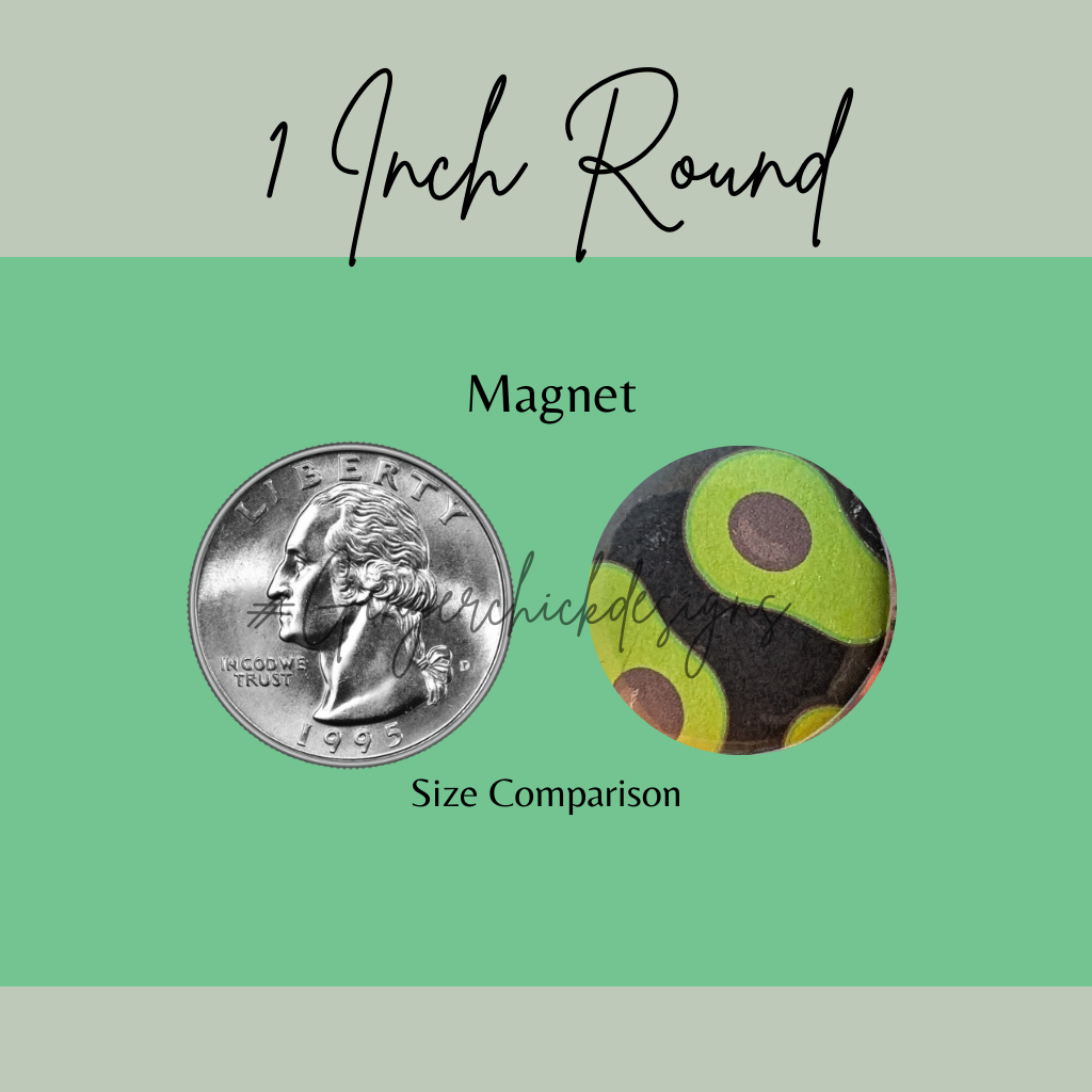 A set of 6 unique button magnets, each measuring 1 inch in diameter.
