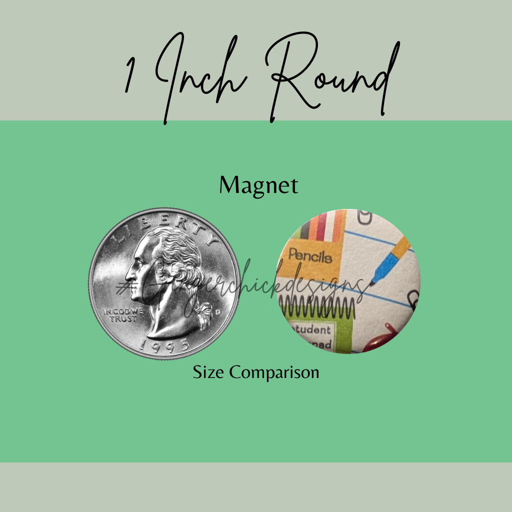 A set of 6 unique button magnets, each measuring 1 inch in diameter.