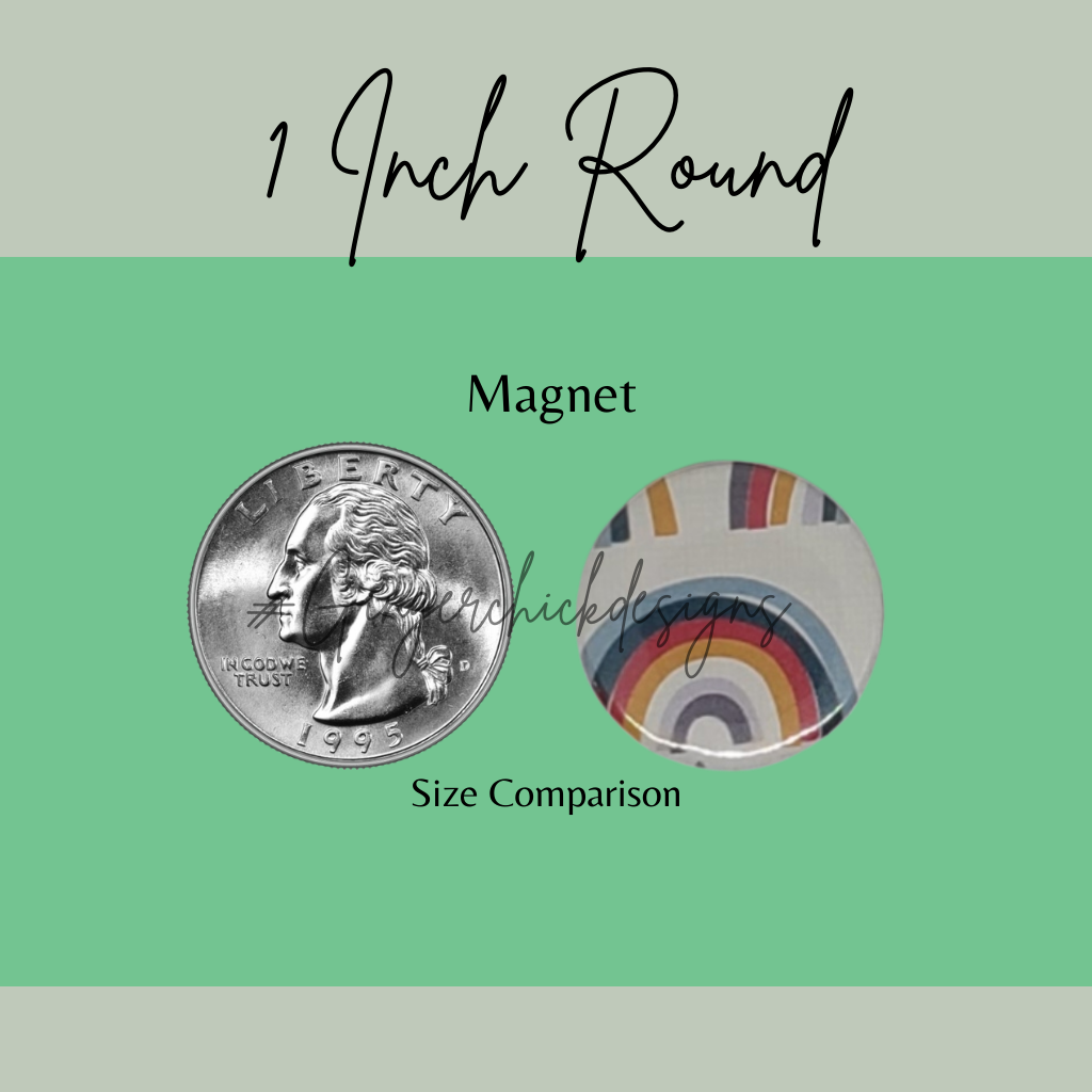 A set of 6 unique button magnets, each measuring 1 inch in diameter.