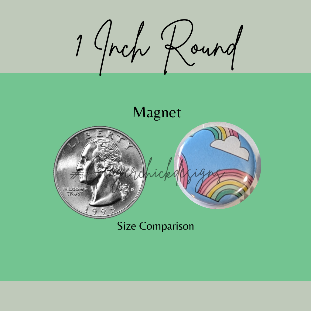 A set of 6 unique button magnets, each measuring 1 inch in diameter.