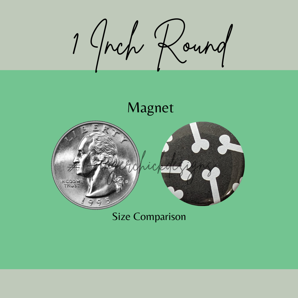 A set of 6 unique button magnets, each measuring 1 inch in diameter.