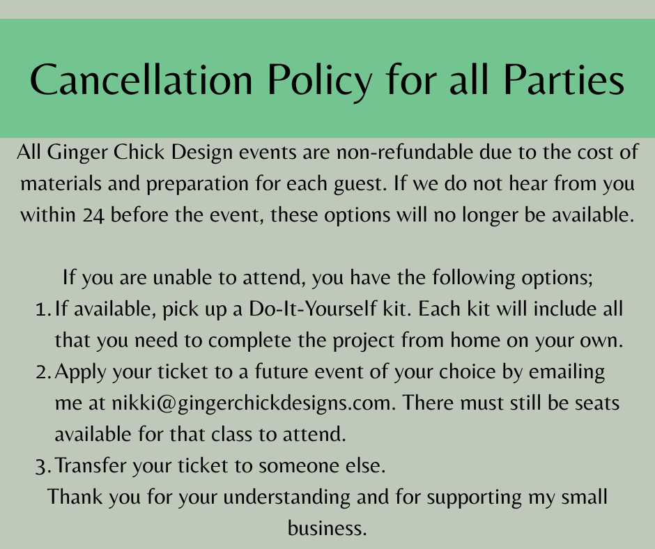 All Ginger Chick Design events are non-refundable due to the cost of materials and preparation for each guest. If we do not hear from you within 24 before the event, these options will no longer be available.