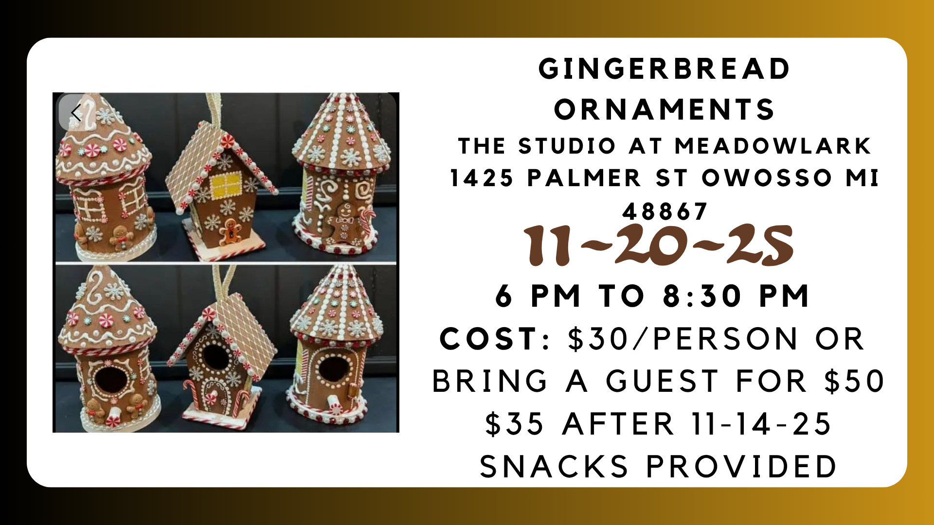 All supplies are provided, and you’ll be guided step-by-step to make your own one-of-a-kind gingerbread creation.