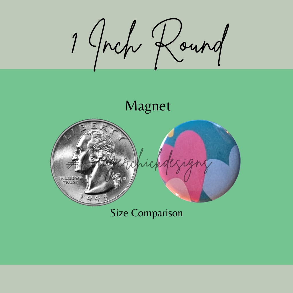 A set of 6 unique button magnets, each measuring 1 inch in diameter.