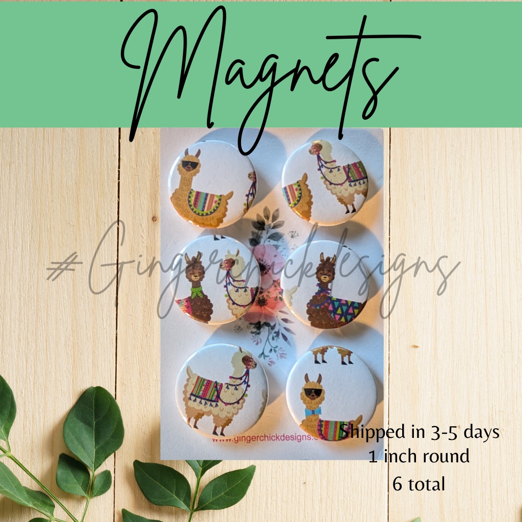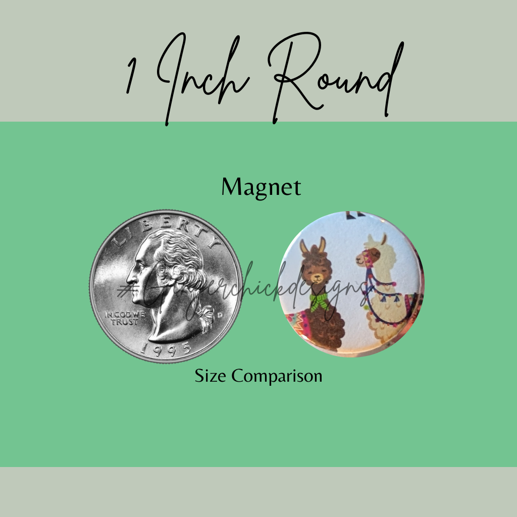 A set of 6 unique button magnets, each measuring 1 inch in diameter.