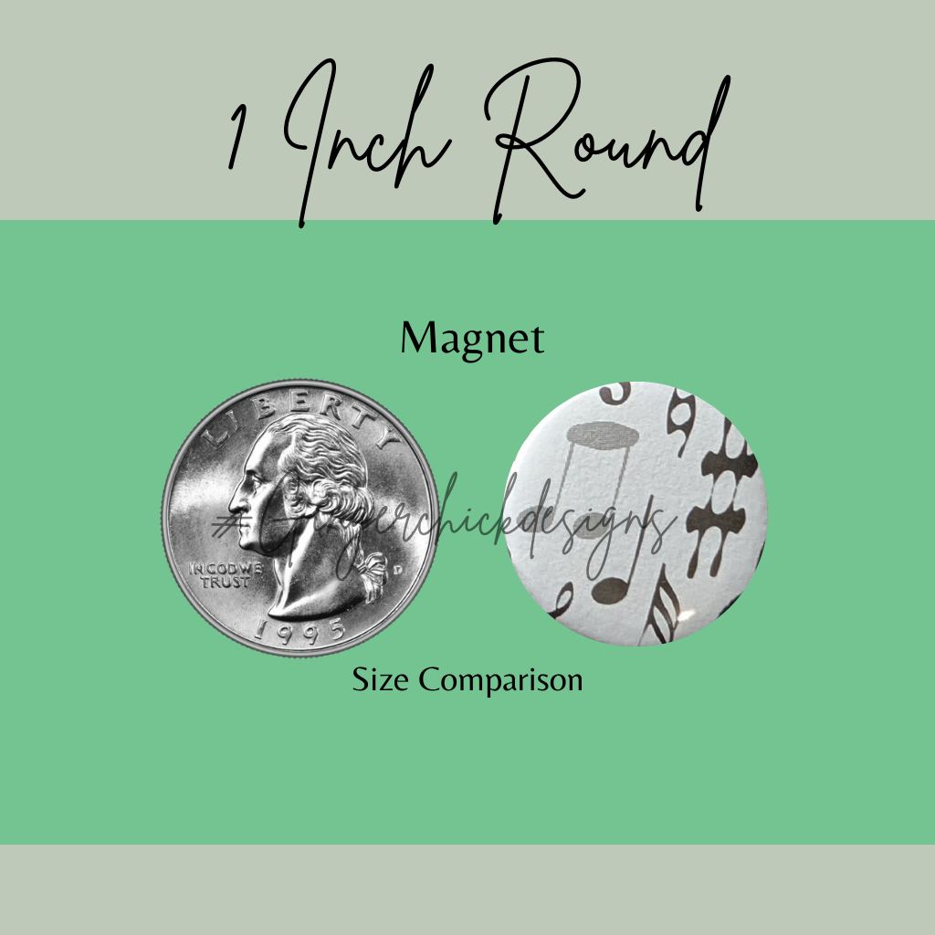 A set of 6 unique button magnets, each measuring 1 inch in diameter.