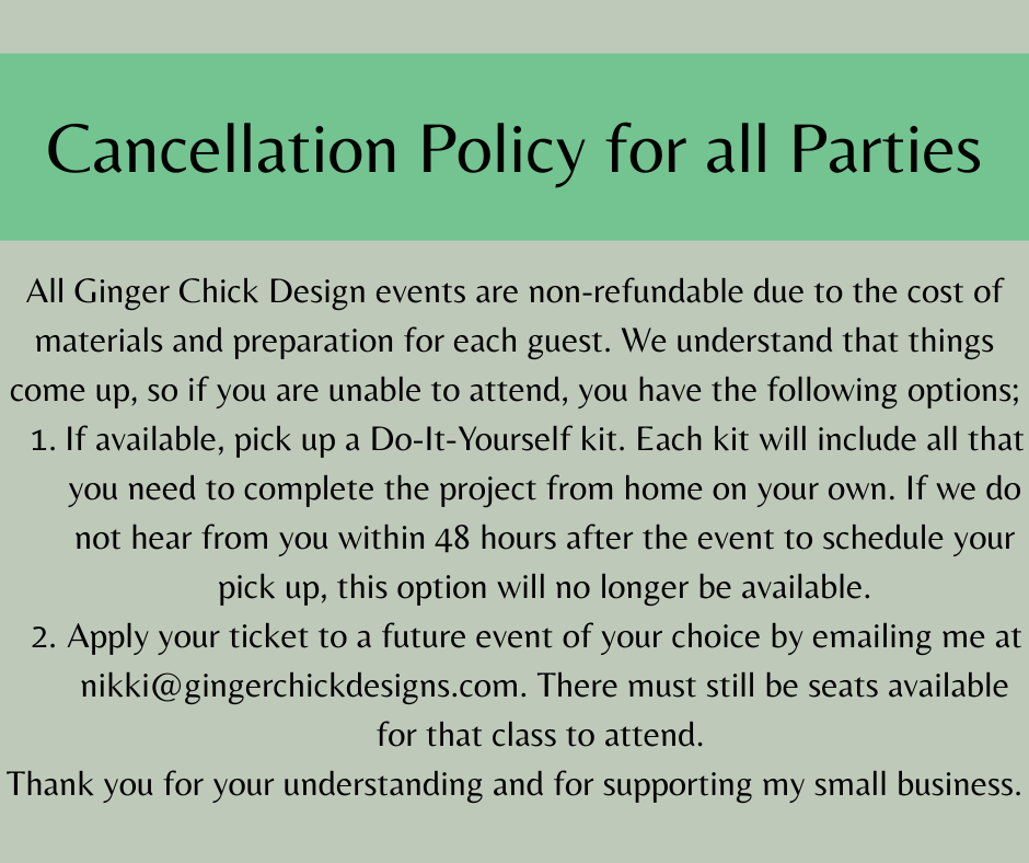 All Ginger Chick Design events are non-refundable due to the cost of materials and preparation for each guest. We understand that things come up, so if you are unable to attend, you have the following options;