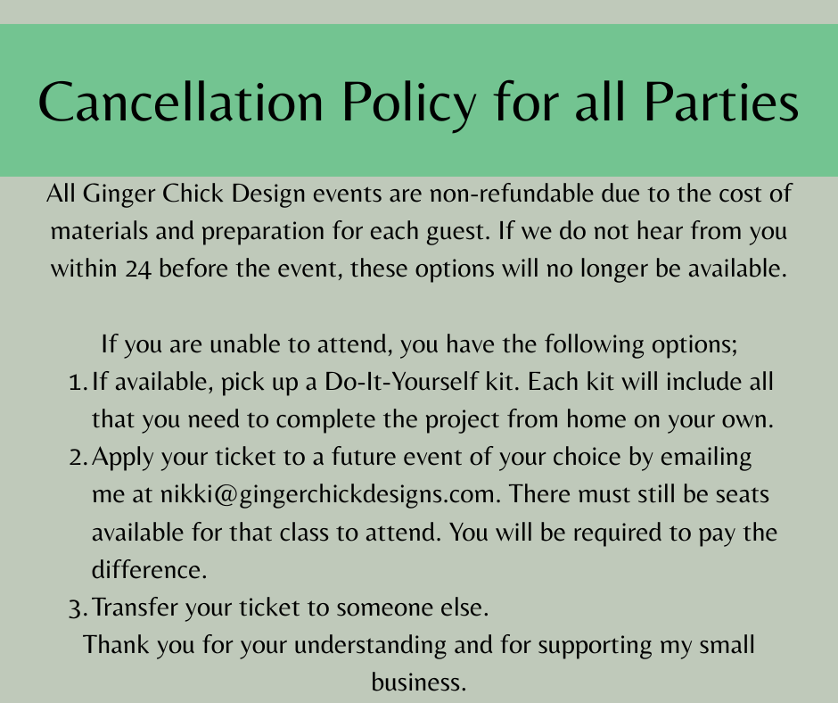 All Ginger Chick Design events are non-refundable due to the cost of materials and preparation for each guest. If we do not hear from you within 24 hours before the event, these options will no longer be available.