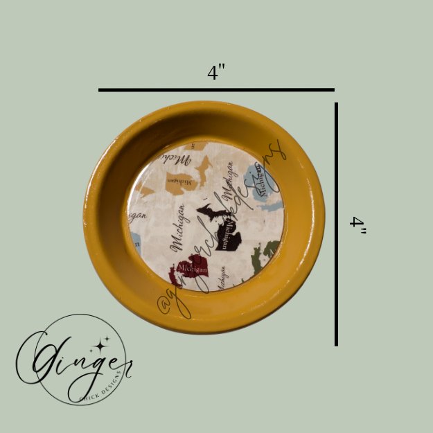 Show off your mitten love with our State of Michigan Mandala Trinket Dish! Hand-painted with care, this 4-inch dish features a unique design inspired by the beauty of the Great Lakes State. Whether you call Michigan home or carry it in your heart, this dish is the perfect way to celebrate your state pride in style.