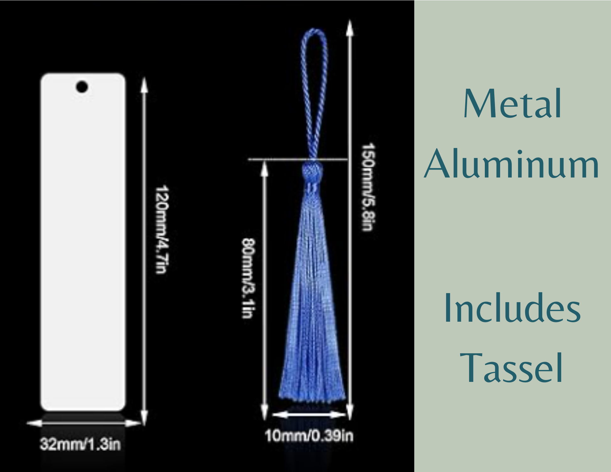 Elevate your reading experience with our beautifully designed sublimated bookmark. Each bookmark is crafted from high-quality Metal Aluminum, ensuring durability and a sleek, modern look. Measuring 1.3 x 4.7 inches, these bookmarks are the perfect size to mark your place in any book. Plus, they come with a coordinating tassel, adding a touch of elegance and charm.