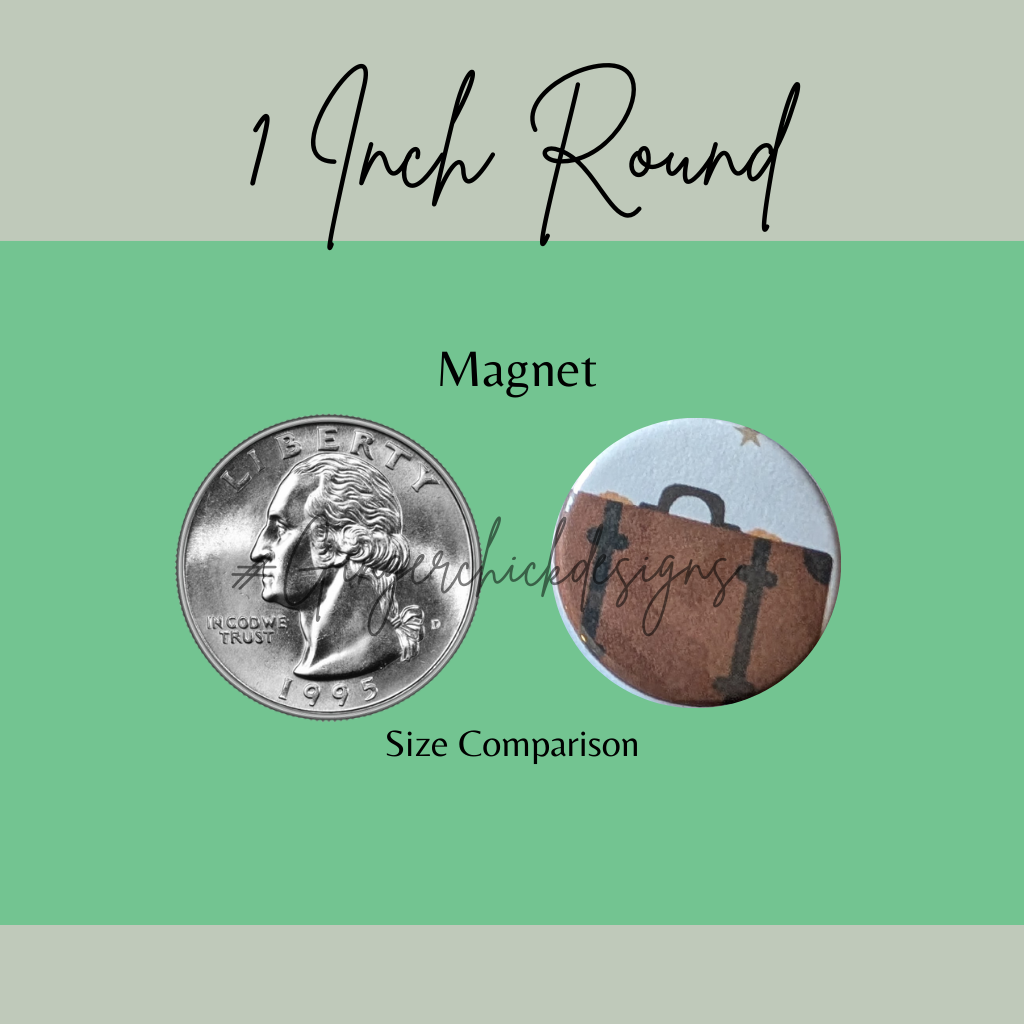 A set of 6 unique button magnets, each measuring 1 inch in diameter.
